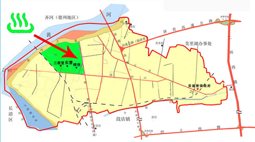 吴家堡片区毗邻济西国家湿地,有小清河、太平河等5条河流流经、近20公里水系及1200亩中央景观绿轴,形成了得天独厚的区域特色。同时,吴家堡镇棉张村一带分布着约1.5平方公里的温泉带,地热储备量较大,出口温度与矿物质含量能满足温泉洗浴与疗养的需要。