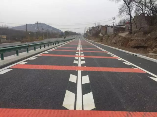 工程路线设计考虑人、车、路、环境四大要素,体现了以人为本的差异化设计理念。项目优化调整了路线指标,沿线除设置纵向振动标线外,横向还设置了更加醒目的红色振动标线,既提高了车辆行驶的安全性,又提升了标线视觉上的警示功能。