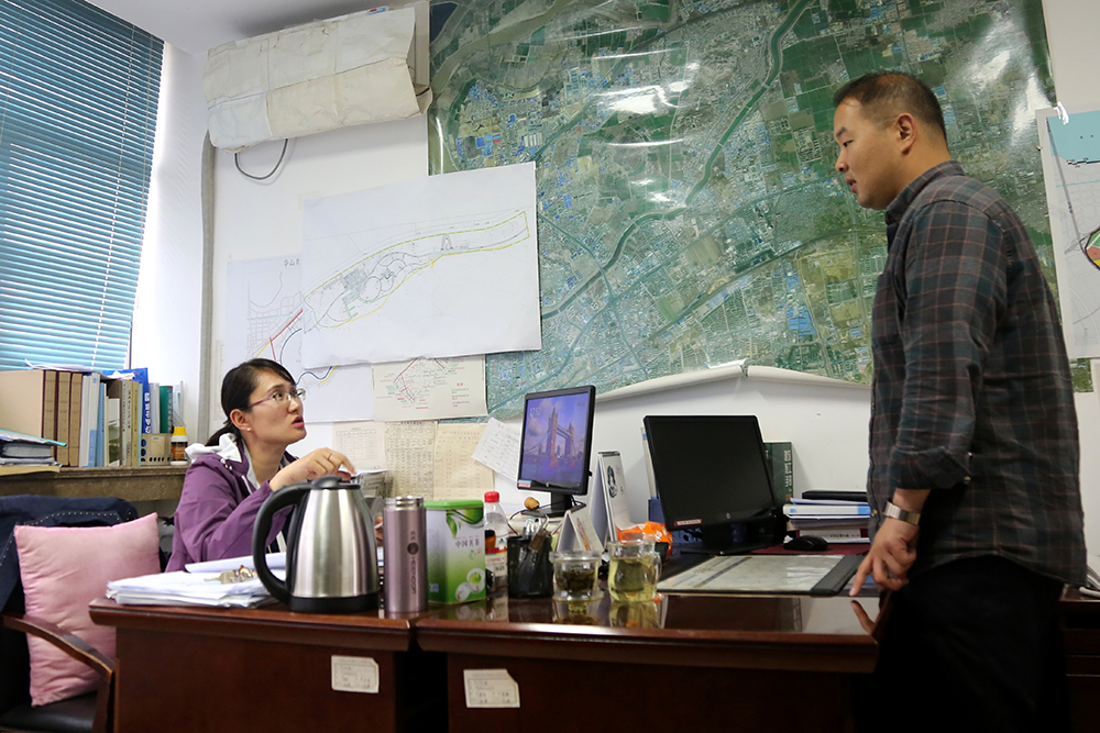 9:50,冯继军离开办公室,要去会议室与同事沟通华山湿地公园里鹊华桥土方、景观亮化相关工程的造价问题。冯继军说话快,走路也快,几乎一路小跑,来不及拿好相机,只能匆匆定格一张“失败”的照片。