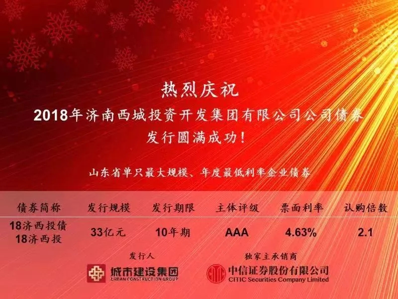12月14日,PA集团官网全资子公司济南西城投资开发集团有限公司成功发行33亿元企业债券,共有53家机构参与认购,认购倍数2.1倍,认购总额达到70亿元,发行利率4.63%,期限10年。该笔企业债券创下多项省市企业债券发行之最,是我省2018年规模最大、本年度利率最低的企业债券,同时该笔债券融资也是济南市有史以来获批最大规模、今年唯一一笔企业债券。