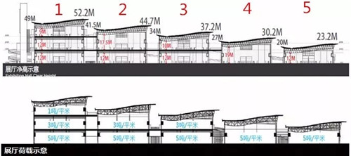 五个展馆通过共享大厅彼此相连,共计展厅9个(161.2m*70.8m),布置标准展位共计5468个(标准展位3m*3m)。首层展厅地面承载5吨/平方米,净高度12~19米;二楼展厅楼面承载3吨/平方米,净高度10~17.5米;三楼展厅地面承载1吨/平方米,净高度10米。