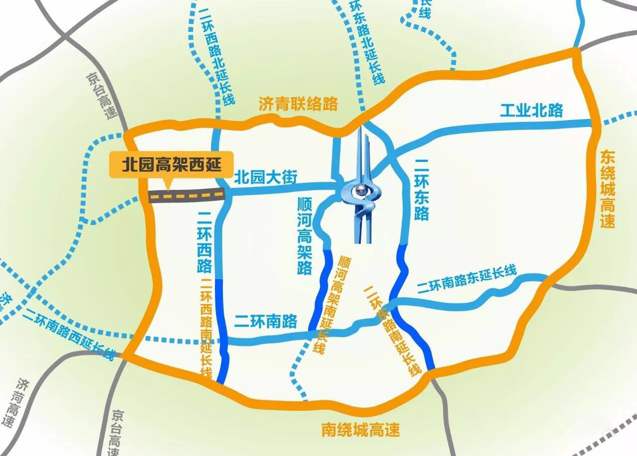 济南市北园大街快速路西延建设工程东起匡山立交桥,西至京台高速西侧规划南北三号路,长约5.6公里。作为第一条横贯城区、连通东西绕城的快速通道,工程将西部城区、中心城区和东部城区、CBD连为一体,连接高铁西站、火车站、新东站、机场等交通枢纽,对助力携河北跨和新旧动能转换先行区建设具有重要意义。