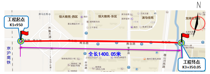 其中,京沪高铁正线以东至腊山河以西标段,全长1400.05米。主要施工内容包括标段范围内新建高架快速路、地面快速路、地面道路及桥梁、立交工程,敷设雨污水管线,配套实施给水、燃气、电力、热力、电信、弱电、中水等管线土建工程,同步进行绿化、照明、交通设施、河道整治、人行过街及海绵城市设施等建设。