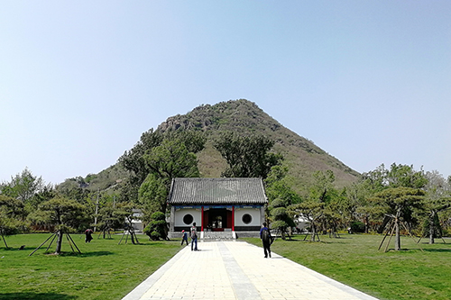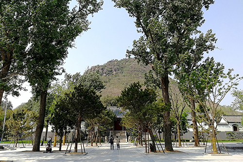 在绿地广场面向一宫门,右侧可以看到卧牛山的全貌,正面对视华山。两侧绿地每侧精选了7棵造型油松,因为华阳宫道家文化的元素多些,此处也有北斗七星的意境。二是采用了借景、点景、框景的园林手法,借一宫门为背景,点造型松为景物,框出清晰的山体轮廓的画面。