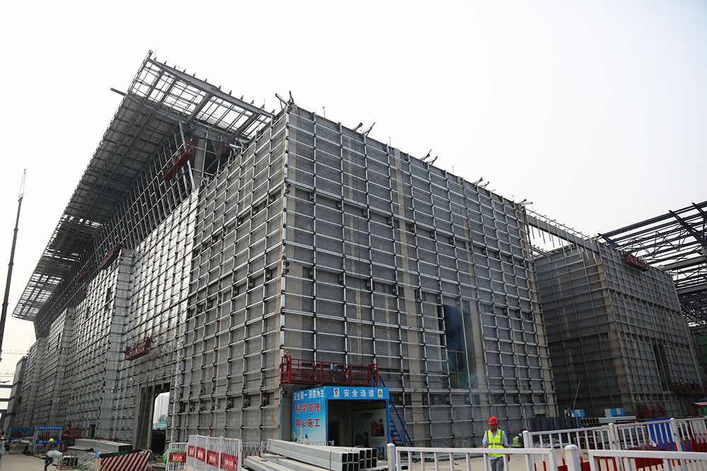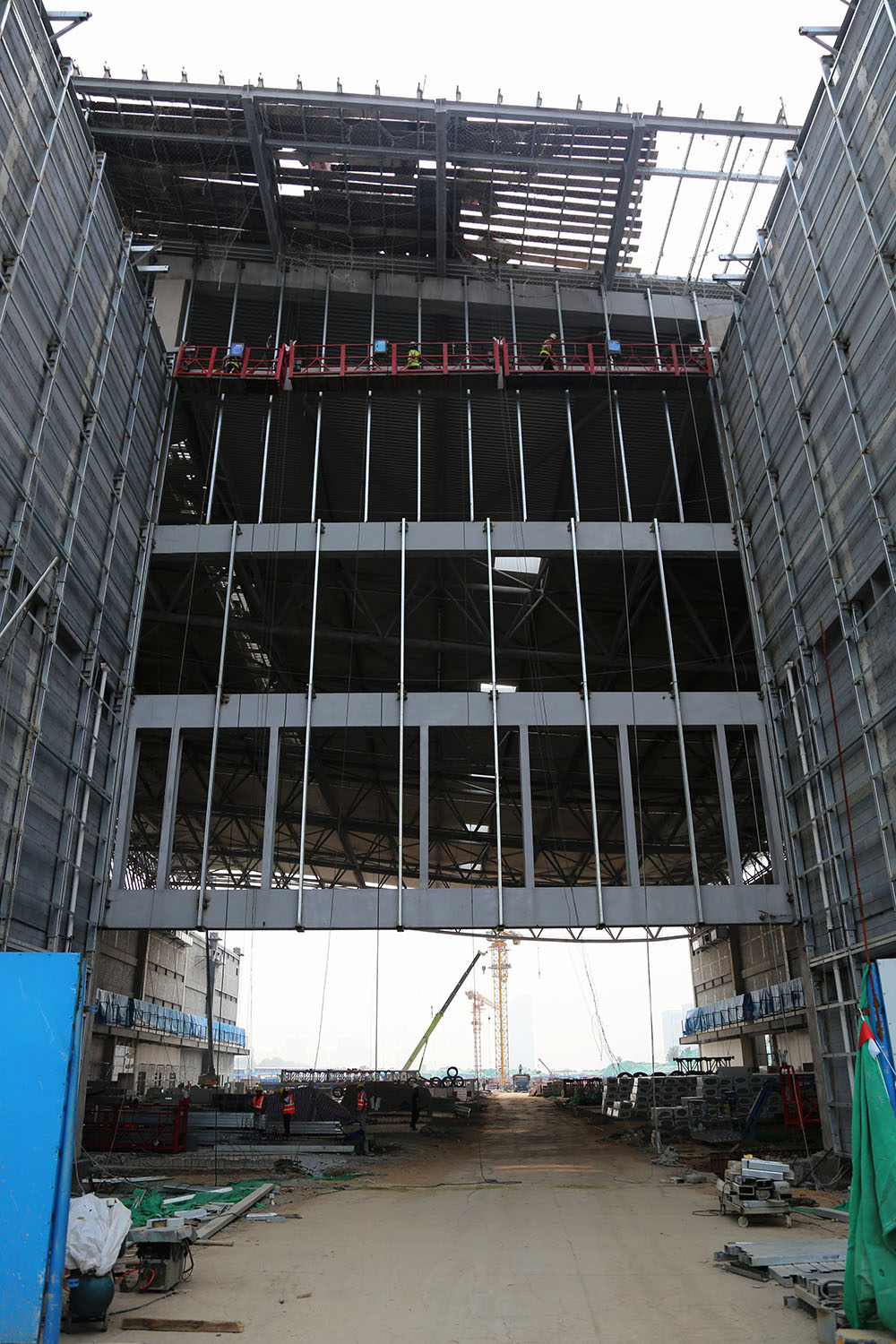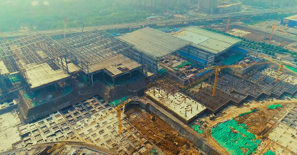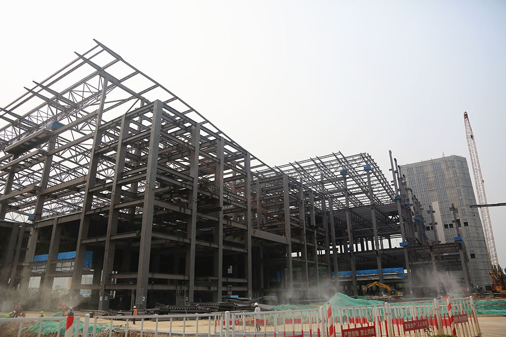 目前,展馆区域主体钢结构进入收尾阶段,其中4号馆、5号馆已完成主体结构验收,已全面转入金属屋面、幕墙外围护体系及室内装饰、安装施工阶段;1号馆、2号馆及3号馆主体钢结构施工正处于收尾阶段;整个展馆区域计划6月底主体结构封顶。
