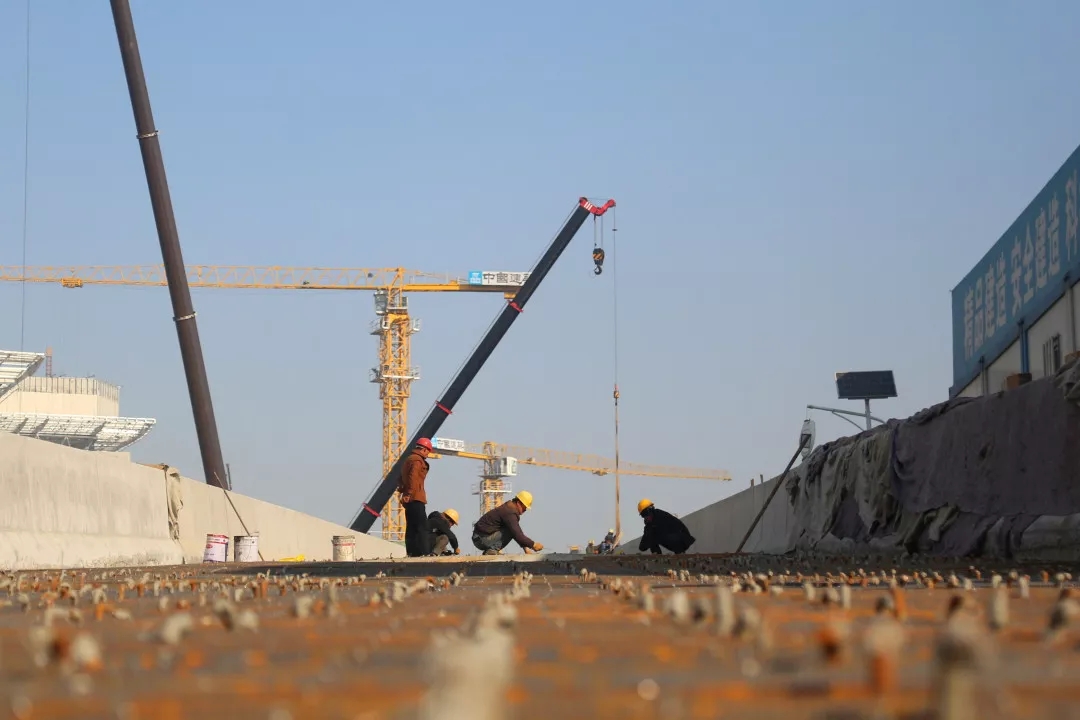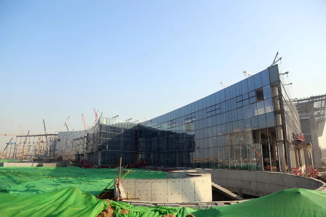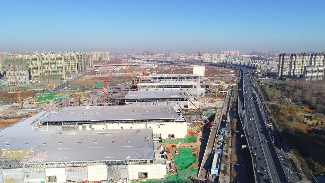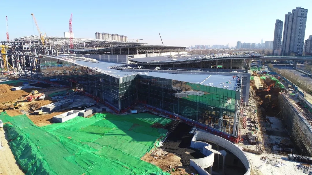 目前,展馆区域已完成5个展馆及4、5号馆共享大厅、西辅房区域主体钢结构与二次结构施工,正在进行装饰安装工程。地下车库已完成除轨道M1线预埋段区域主体结构施工,正在进行二次结构、装饰安装、室外回填及剩余地下车库主体结构工程施工。