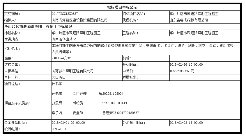 华山片区市政道路照明工程施工中标公示