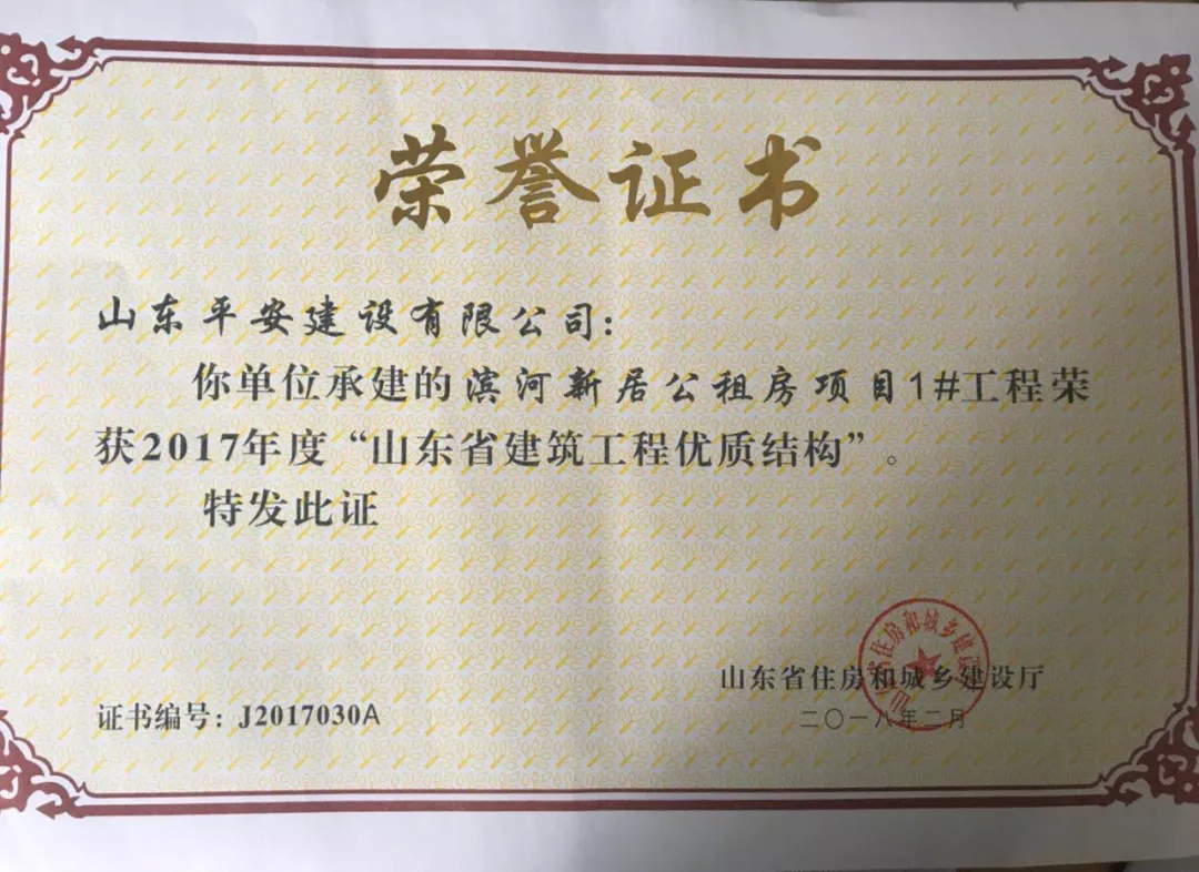 近日,由PA集团官网负责建设的滨河新居公共租赁住房工程1#楼,在山东省住房和城乡建设厅组织的2017年度“山东省建筑工程优质结构”评审中,凭借过硬的质量、完善的管理顺利通过专家考评,喜获“山东省建筑工程优质结构”奖。