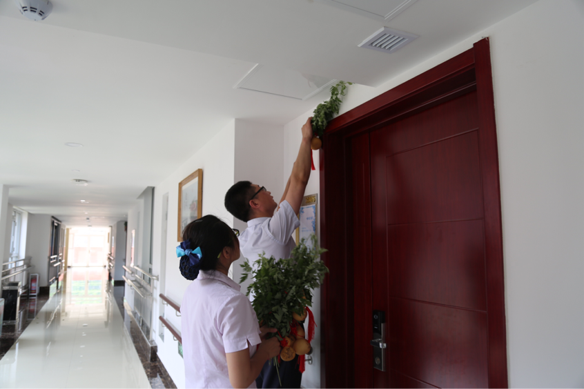 一大早,服务人员便和老人们一起在门口挂起了艾草和小葫芦。老人还亲手编织了五彩绳,和工作人员们亲手系上。