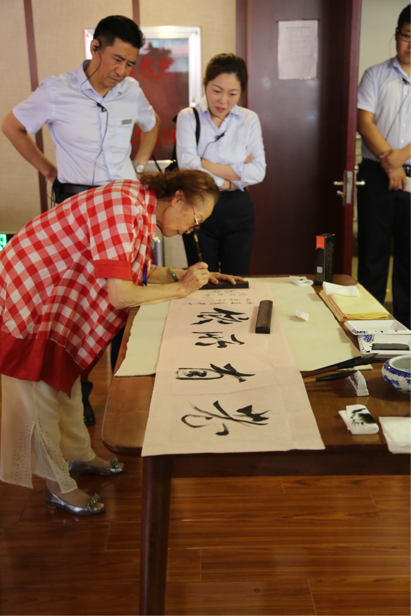 包好了粽子,孙忠华即兴为养老服务中心题字一幅,她说:“你们这个地方让我感觉温暖,大家亲得就像一家人,所以啊,我就写老有所依!”