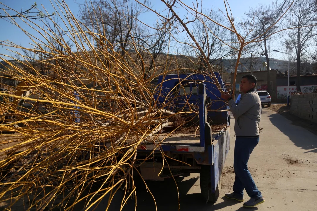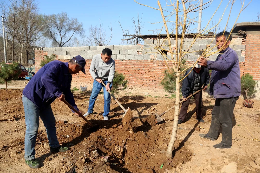 “他们都这么大年纪了,还来帮村里干活,咱这年轻人更不能闲着啊”,扛树苗、挥锹培土,王栋栋俯下身子,干得有模有样。一个小时的忙碌,裸土焕然一新,一片新绿装点着山村的早春。
