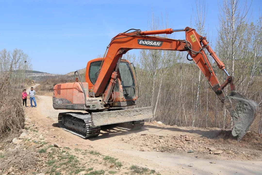 11:20王栋栋和任书记在生产路整修现场。村北侧的生产路是连通大黄崖村与农田果园的道路,也是通往邻村陶裕村最便捷的道路。去年受大雨影响,道路严重受损,随时有塌陷的危险,给群众生产生活带来诸多不便。他带领村两委和部分党员群众,利用三天时间对道路进行了修复,抢修出了一条临时通道。要彻底解决道路塌陷问题,就一定要重新翻修,日前,他从县交通部门争取的资金已经到位,施工队伍已进场施工,目前正处于找平碾压过程中,很快就将进行道路硬化,一周时间即可恢复通行。