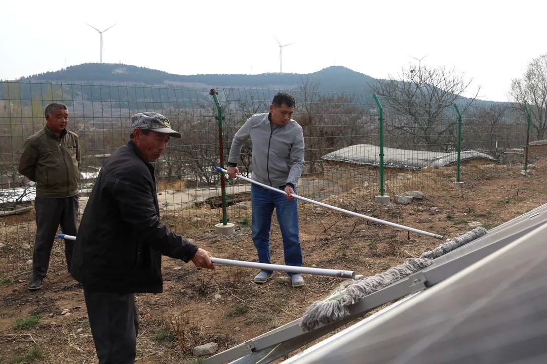 13:30沿着陡峭山路晚上走,王栋栋来到了村里的光伏发电项目,“有两块光伏板坏掉了,要及时向扶贫办报修调换,不然会影响发电量”。王栋栋叮嘱管理人员。报修完之后,王栋栋和维护人员一起对光伏板进行擦洗维护。