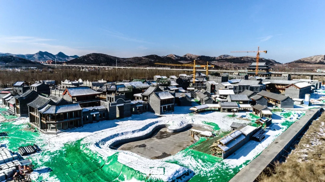 正在建设冲刺中的老济南街,兼具明清与民国风情的各色建筑韵味初显,亲王府、城隍庙、城门楼、书院、医院、警察局等各类建筑一目了然,园区氛围日益浓厚起来,不久的将来,这些场景都将会出现在影视作品中。现场施工负责人表示,现场正在开足马力抢工收尾,目前园区内共有500余名工人在不同区域,进行各个单体围墙施工、管道及地面铺装、城墙砌筑与热力等工作,确保4月15日项目主体工程竣工,达到可拍摄条件。