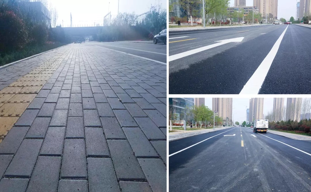 在各参建单位的配合下,先后完成工程施工范围内的地下管线及道路结构层施工。并于4月5日完成沥青面层摊铺,4月7日完成人行道花砖铺设。