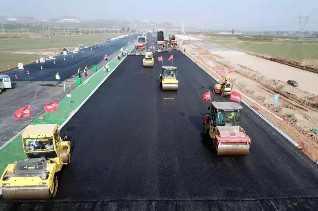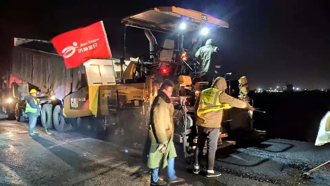 为确保项目建设进度,尤其是在寒潮低温前确保水稳基层、沥青面层节点工期,项目部技术人员奋战在施工一线,昼夜赶工,掀起持续大干72小时施工热潮。项目部合理规划,根据情况及时调整施工方案,加大人力、物力投入,两个水稳基层、两个沥青面层作业面同时进行施工。夜间施工中,一线建设者“挑灯夜战”,摊铺机、压路机、装载机等各种机械配合施工,形成了一条有序的机械操作流水线。同时,施工完成后,项目部进行自检、监理检测和业主抽检,平整度、压实度、厚度等各项指标全部合格,为项目后续路面施工奠定了扎实的基础。