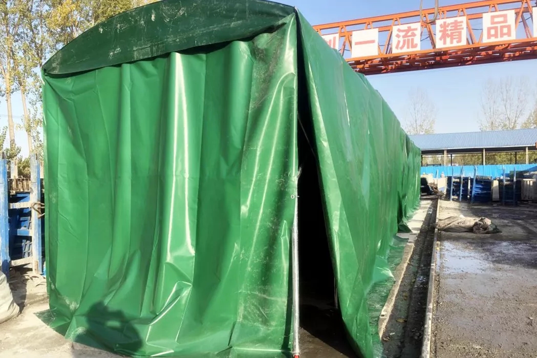 为克服低温影响,项目预制梁板冬季养生主要采用暖棚蒸汽养生方法。利用钢筋或镀锌管搭设养生暖棚,暖棚用塑料布密封,外面再覆盖厚篷布,使厚棚布和梁板之间有空隙,确保梁板各部位能够均匀保温保湿。同时,现场安排专人负责,定期测量大棚内外温度,确保蒸汽养生工作平稳顺利进行。