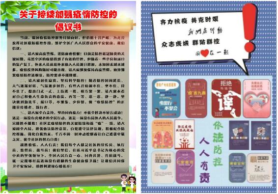 街道社区和集团印发了《新冠肺炎防控知识手册》、《关于持续加强疫情防控的倡议书》等宣传手册、宣传页,对新型冠状病毒感染的肺炎的相关知识进行了答疑解惑。目前我国疫情防控形势持续好转,但疫情尚未解除,现阶段境外输入日益加剧,疫情防控不容麻痹松懈,提醒居民出入务必佩戴好口罩,做好个人防护,如有省外返济或境外旅居史的要及时上报。