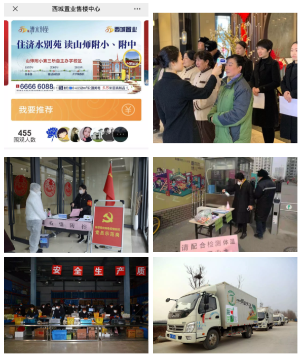 在集团党委的引领下,各级党组织、所属企业积极响应,主动作为,各企业主要负责同志认真履行第一责任人职责,对疫情防控工作亲自安排部署、亲自组织推动、亲自跟踪问效,充分发挥自身优势,组织调配资源和力量,全力做好疫情防控服务保障,以实际行动践行使命和责任担当。集团杨柳春风、西城·济水上苑等地产项目暂停营销接待工作,坚持每天开展全面、持续消毒,加强园区、写字楼的联防联控,启动线上VR看房通道,足不出户在家安心看房,让客户享受便捷、周到的服务。西城资产公司在西城大厦一层南门设置“消毒回廊”,公司防控小组每天到西客站东场综合体、西城大厦、东广场地下停车场、东广场地下餐厅及长清西部创新园项目、大学城 9 号楼、长清安置三区等 7 个项目督导检查疫情防控工作情况,确保区域防控措施落实到位。济西农场公司全员上岗,加班加点,将线上与线下销售平台相结合,每天向市内配送平价新鲜蔬菜,为疫情期间全市蔬菜市场供应和稳定做出了积极贡献。