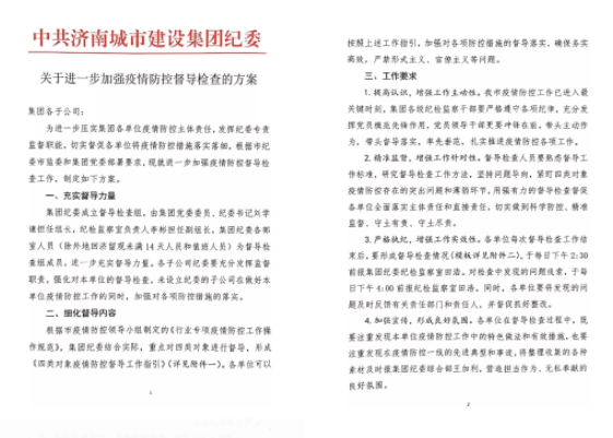 济南城建集团、黄河路桥集团、济南金曰、金宇公司等单位严格做好工地项目的排查防控,备齐防控物资并第一时间发放至项目部一线职工,严格执行体温检测、统计上报制度,对省外来济返济职工做好登记和排查,严格控制建筑工地人员进出,设置废弃口罩集中回收桶,确保防控措施落实到位。泉世界商业公司、山东金龄健康公司、济西湿地公司、园博园公司等单位严格执行闭园规定,全面做好封闭管理和疫情检测等工作,强化安保人员执勤及巡逻,加大对公共场所和办公区域的消杀力度,防止传染性疾病的发生和蔓延。