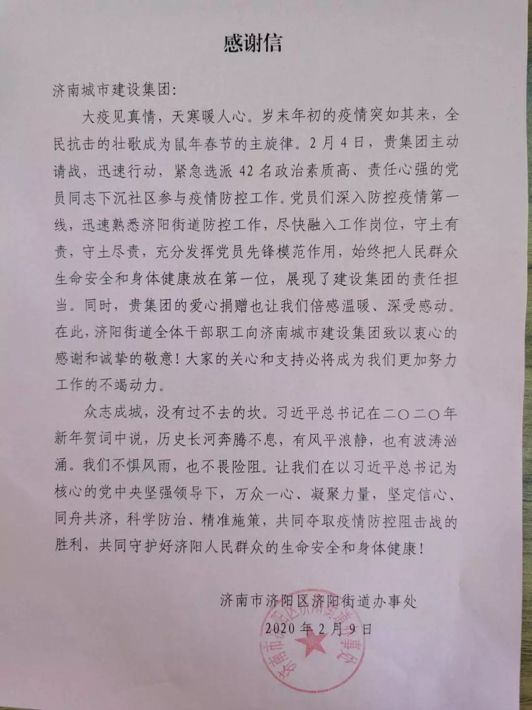 济阳街道办事处专门给集团写了感谢信,济阳街道康瑞社区与雅居园物业管理有限公司还向吕仁镇、齐鹏飞两名党员同志赠送了写有“抗击疫情勇担当,志愿服务争先锋”的锦旗。