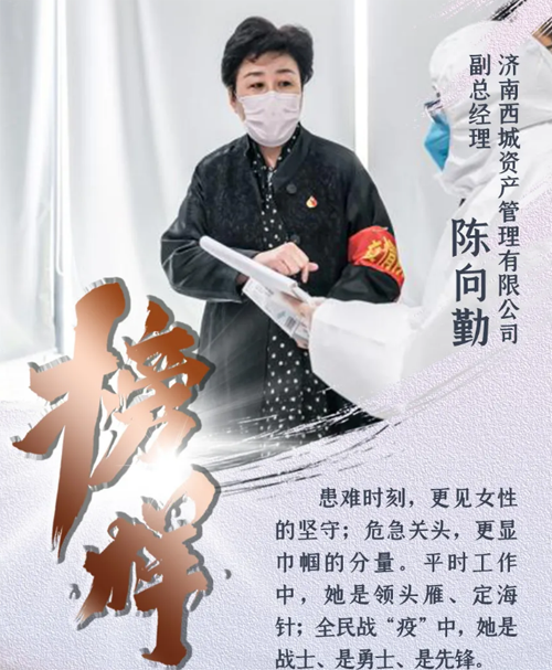 “疫情面前严防死守,不放过任何一个细节,所有一切都是为了国有资产的安全。”作为济南西城资产管理有限公司负责人,在疫情防控初期,陈向勤临危不乱、从容指挥,她认真学习各级精神指示和决策部署,以“明确责任、联防联控”为主基调,亲自调度指挥,率先组织成立疫情处置工作领导小组,紧急出台《新型冠状病毒肺炎疫情防控工作操作指引(试行)》、《新型冠状病毒感染的肺炎疫情处置预案》等防控工作指导性文件。