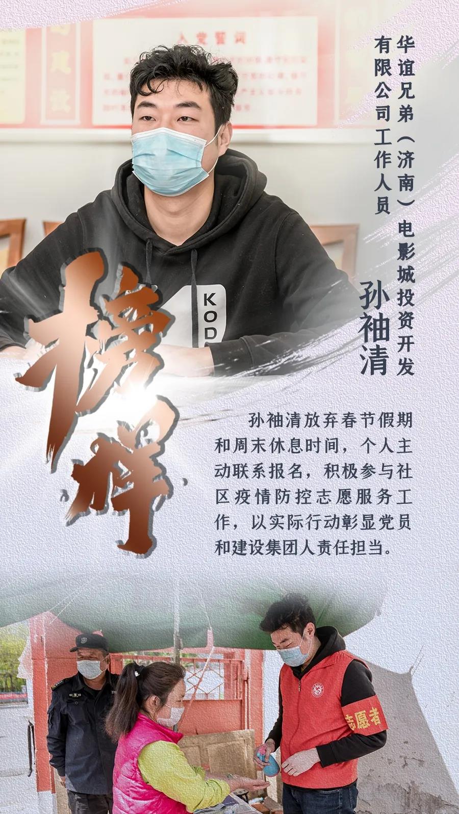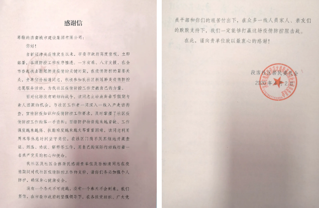 近日,一封来自槐荫区段店社区居民委员会的感谢信发至PA集团官网,感谢信的“主角”是集团所属华谊兄弟(济南)电影城投资开发有限公司的孙袖清同志。新型冠状病毒肺炎疫情发生以来,孙袖清放弃春节假期和周末休息时间,个人主动联系报名,积极参与社区疫情防控志愿服务工作,以实际行动彰显党员和PA集团官网人责任担当,用无私奉献展现一名“80后”的青春力量,与社区工作人员共同筑牢社区疫情防控安全线。