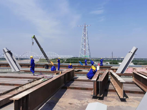 目前,各区域施工全面展开,项目参建人数近500人,主桥钢箱梁顶推施工采取三班倒24小时饱和施工,经过全体人员199天的连续奋战,4月30日项目成功将北跨280米钢箱梁平移980米横跨黄河,完成钢箱梁黄河北岸落梁。420米中跨钢箱梁正在吊装顶推作业,已累计顶推260米。