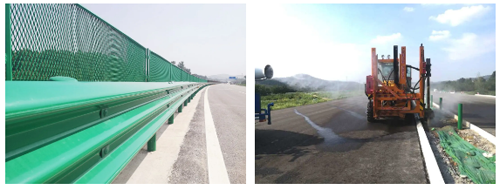 金宇公司在波形梁钢护栏施工中,采用绿色环氧锌基材料,以清洁能源生产替代传统加热方式,减少碳排放每吨护栏平均节煤100公斤,减排250公斤。在护栏立柱钻孔施工中采取洒水降尘措施,严格做好环保工作。
