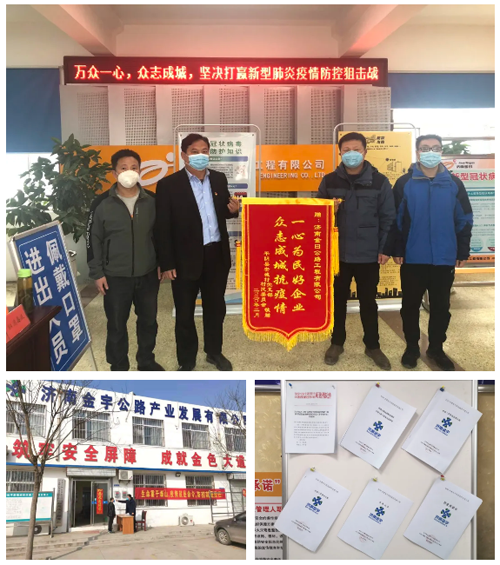 疫情来势汹汹,在严峻条件下金曰公司、金宇公司等项目部主动出击,储备防疫物资,制作宣传标语,协调人员调度,一手抓防疫,一手抓复工,坚持“两手抓”,夺取“双胜利”。金曰公司项目部为沿线的8个村庄和济菏高速收费站捐献了生活必需品、防疫物资,协助当地镇政府开展疫情防控工作,积极承担社会责任。