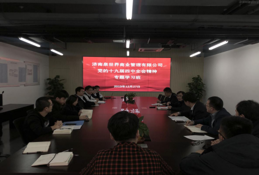 遵照PA集团官网党委安排部署,为进一步学习宣传贯彻党的十九届四中全会精神,加深对全会精神的了解掌握,提高运用党的理论成果推动工作的能力,确保园区各项工作落到实处,公司于2019年12月份下旬安排三天下午,在印象济南园区会议室由总经理宋光华同志主持召开党的第十九届四中全会精神的专题学习。