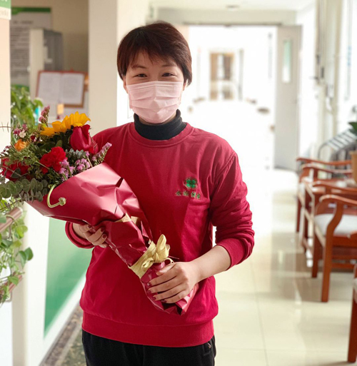 许娟,金龄健康产业投资(山东)有限公司运营部经理,负责照料园区老人的日常生活。直到有人将鲜花送到,她才意识到当天是国际妇女节。自春节以来,许娟与丈夫因为都在一线单位工作几乎没有碰面,两个年幼的女儿只能托付给公婆照看,她把家人的付出与支持化作对工作的热忱,将这份爱传递给身边的每一个人。