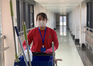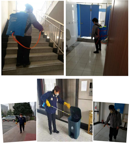 保洁员于秀菊,自春节以来,每天坚持对办公区域消毒至少3遍,每天都是等到全部人员离开后,于秀菊对各区域进行最后一次消毒最后一个离开公司。