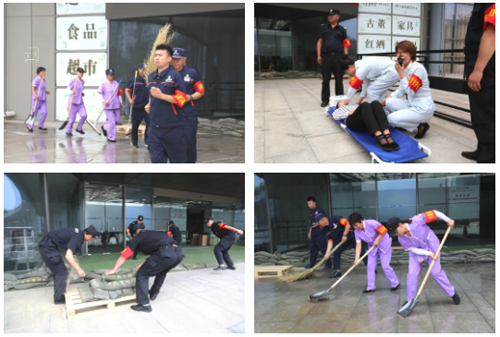 6月9日上午9点,防汛应急演练活动正式开始,本次演练模拟暴雨极端天气背景下,物业单位发现汛情后立即启动防汛应急预案,采取筑沙袋墙、快速处置积水、转移商品至安全处、救护伤员等一系列防汛抢险措施。整个演练过程组织有序、响应快速、配合默契,妥善的处置了河水倒灌及水患。