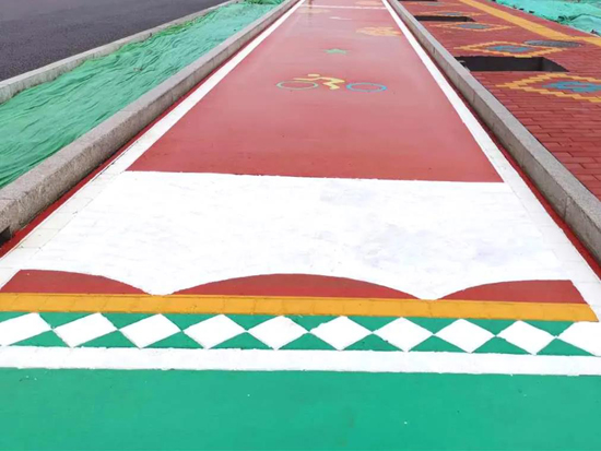 此次创新将SP彩色压花、荧光沥青路面工艺在慢车道上进行试验,施工时选用红、绿、蓝三种基础颜色分段进行。通过喷涂SP专用涂料,改变沥青面层颜色,不但提高了道路辨识度,同时能够在无分隔带道路中明确机非车道界限,有利于规范非机动车规范行车,降低事故发生概率。
