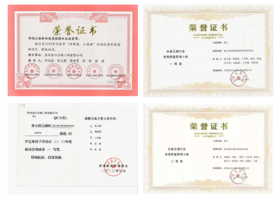 项目在保证施工安全、质量、工期的同时,积极开展优化、创新活动。“精工”QC小组《减小新旧路基搭接处的病害率》课题,被济南市质量管理协会评为2020年度一等奖,山东公路协会一等奖,并被评为2020年济南市“讲理想、比贡献”活动优秀科技创新项目;“腾飞”QC小组《提高通行路段围挡清洁度》课题,被济南市质量管理协会评为2020年度二等奖。