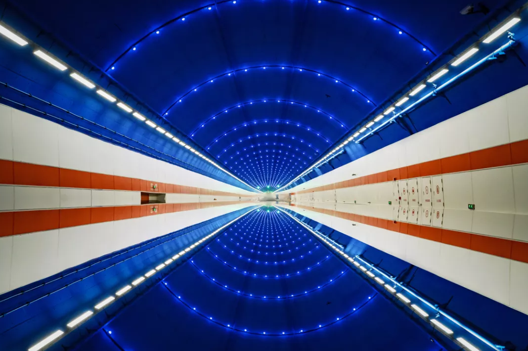 济南黄河济泺路隧道设计方案以黄河文化根脉为基,黄河之“光”为“场”,融合黄河历史、文化、自然、艺术等表现黄河两岸是我家。“黄河根脉岁岁安澜”主题设计定位为城河相融,动静相融,蕴含“天人合一”的设计理念,让黄河隧道艺术空间景观和自然互为补充。设计中借黄河水纹传统纹样,将黄河文化与自然生态中的场地、色彩、光影结合,再造了黄河地形与黄河流动的自然之美,描绘了新时代黄河画卷中诗情画意的城市底蕴。