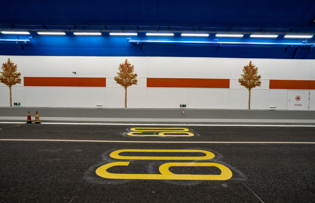 保持隧道主体工程结构不变,通过增加装饰,实现整体设计提升。隧道南北出口声屏障以“岁岁九曲弯”和“岁岁安澜”为设计主题,以中国传统装饰纹样呈现,夜晚还将呈现“日出黄河”的灯光效果。添加“流动”与“水纹”的造型体现了黄河穿越之美,在隧道内采用3D打印贴膜工艺绘制白杨树(寓意坚韧、表达力求上进的精神),以缓解驾驶员视觉疲劳。同时以黄河星空为题,中间段顶部弧线的灯光表现黄河穿越之感,暖色照明设计表现,感受黄河星空光线流动之美。