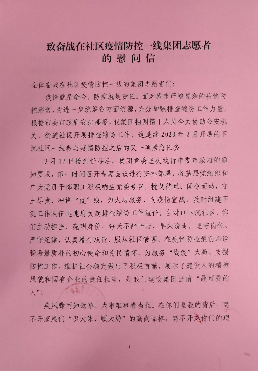 鉴于当前我市疫情防控形势,集团党委不能去一线慰问,但对于你们在一线的工作情况无时无刻不在关注,对于你们遇到的困难,将会尽最大努力予以帮助解决,集团党委就是你们最大的底气、最坚实的后盾。集团所属各级党组织要切实做好参与社区服务同志们的后勤保障工作,给予同志们更多关心关爱。同时,希望大家在服务社区疫情防控工作中,进一步提高政治站位,严守工作要求,形成工作合力,全力以赴投入到工作中去。另外,大家来回路上要谨慎驾驶,确保行车安全;工作中做好自我防护,确保自身安全。