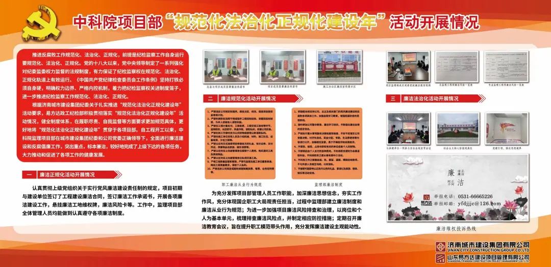 调研组一行先后到济钢森林公园地下商业项目、中国科学院空天信息创新研究院济南园区(一期)建设项目现场察看,详细了解了项目疫情防控、规范化法治化正规化建设、安全生产、项目建设推进等管理情况。通过调研,对两个项目在疫情防控、推动廉洁文化及规范化法治化正规化建设方面取得的工作成效给予高度肯定。易方达公司在业务开展的各个环节中,能够持续推进重点项目规范化法治化正规化建设,积极落实项目部党风廉政建设责任制,全面签订廉政工作承诺书,建立健全反腐倡廉制度及职工“廉洁从业行为十条规范”,全面排查廉政风险,做到自上而下保持廉洁风气。