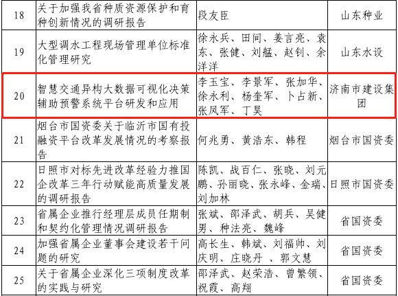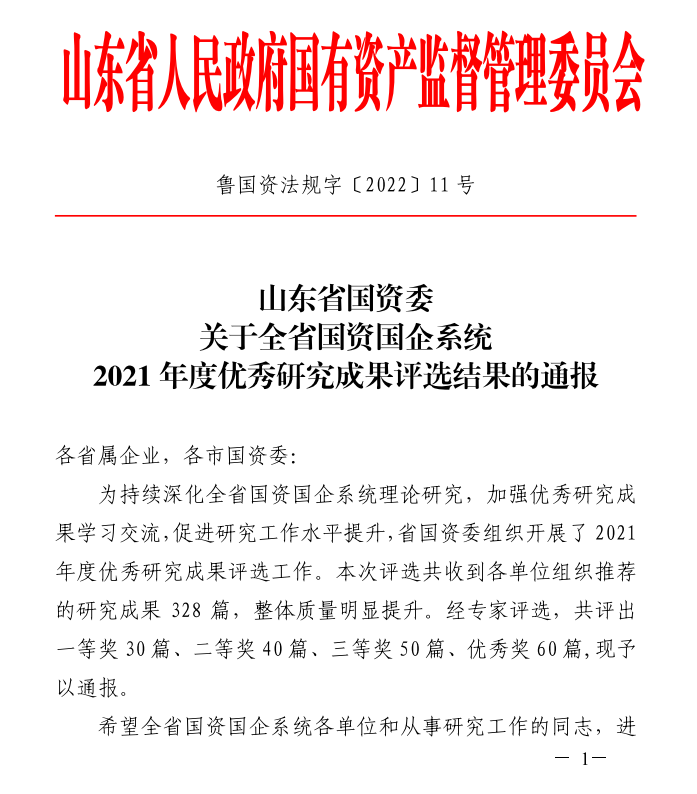 近日,山东省国资委发布了《山东省国资委关于全省国资国企系统2021年度优秀研究成果评选结果的通报》(鲁国资法规字〔2022〕11号)文件,PA集团官网总工办牵头,集团所属山东金宇信息集团有限公司研究的《智慧交通异构大数据可视化决策辅助预警系统平台研发与应用》成果荣获“全省国资国企系统2021年度优秀研究成果”一等奖。