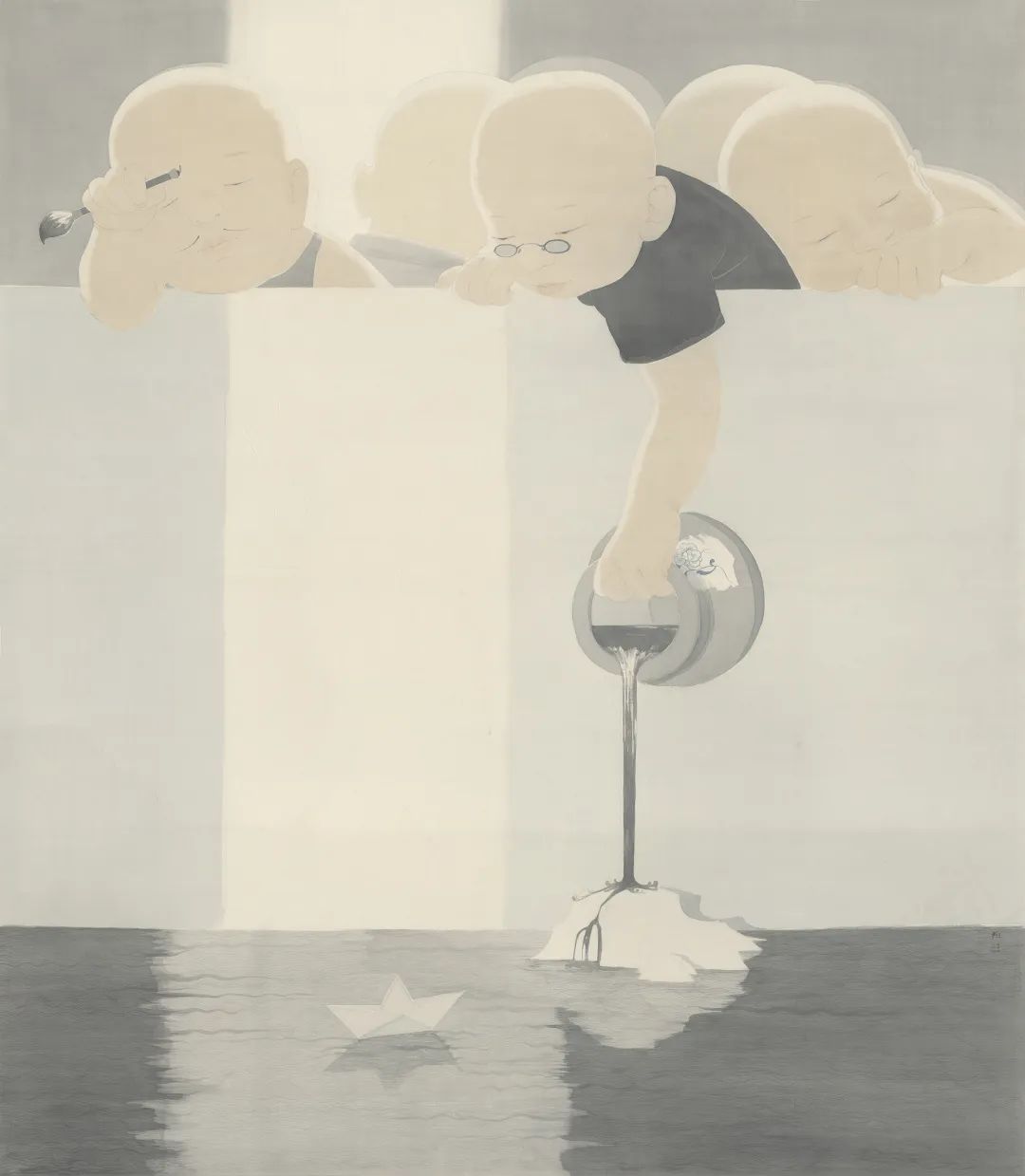 作品《夏》以泉文化为题,画中的五个孩童,以孩童的视角展示生命里纯粹的感受。画面中,泉娃预示着生命之始,泉水预示着生命之源。同时,毛笔与墨汁展示着传统和文化,纸船映射着远方与航向,光绽放着温暖与希望。画中调子暖灰色,画面祥和安宁,作品从中也映射出,在日新月异的泉城济南,在人们的不断改革、创新和发展下,孩子们才能够有了更加安定祥和的空间与环境。