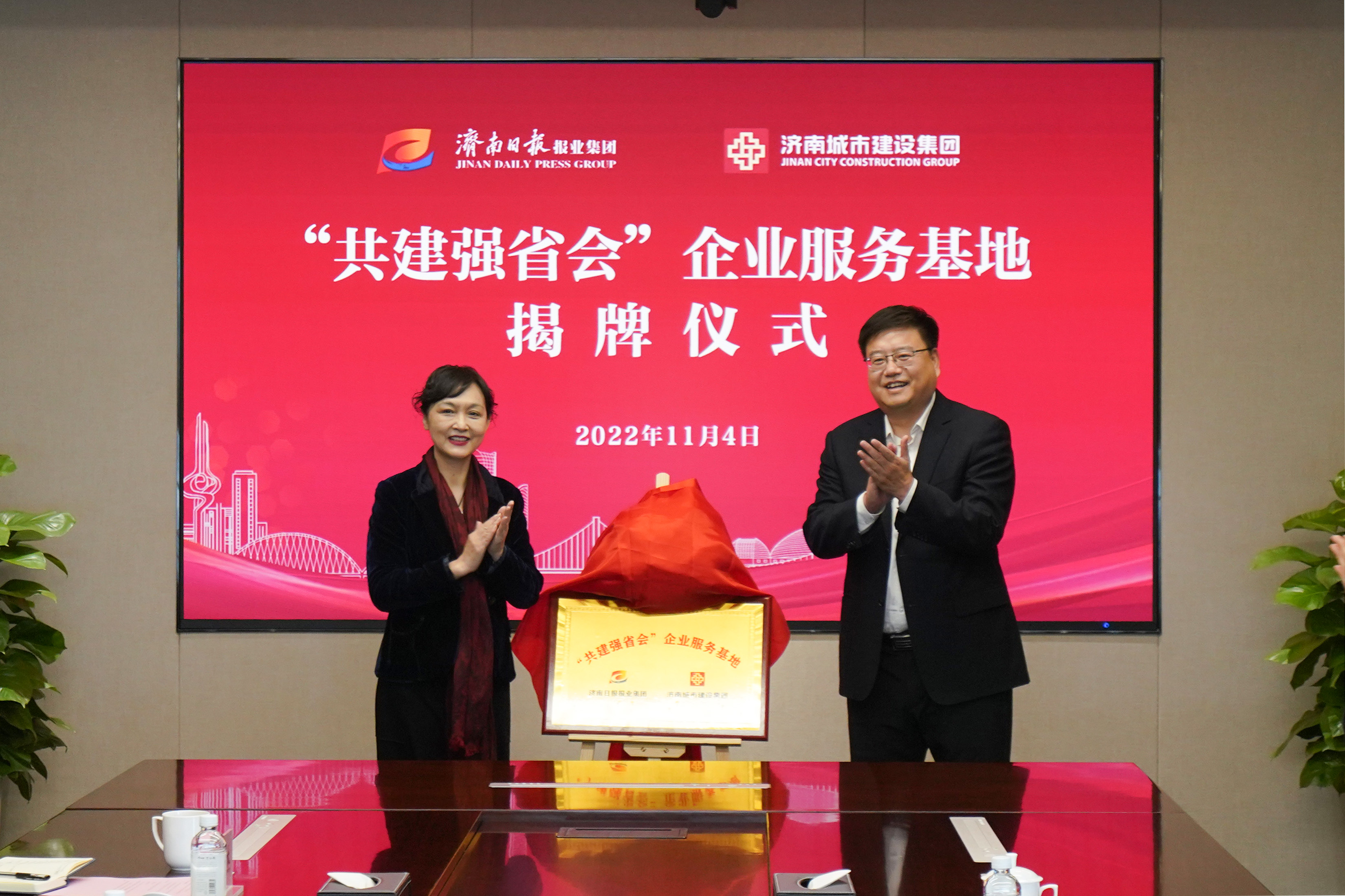 马利、史海成同志共同为济南日报报业集团、PA集团官网“共建强省会”企业服务基地揭牌。