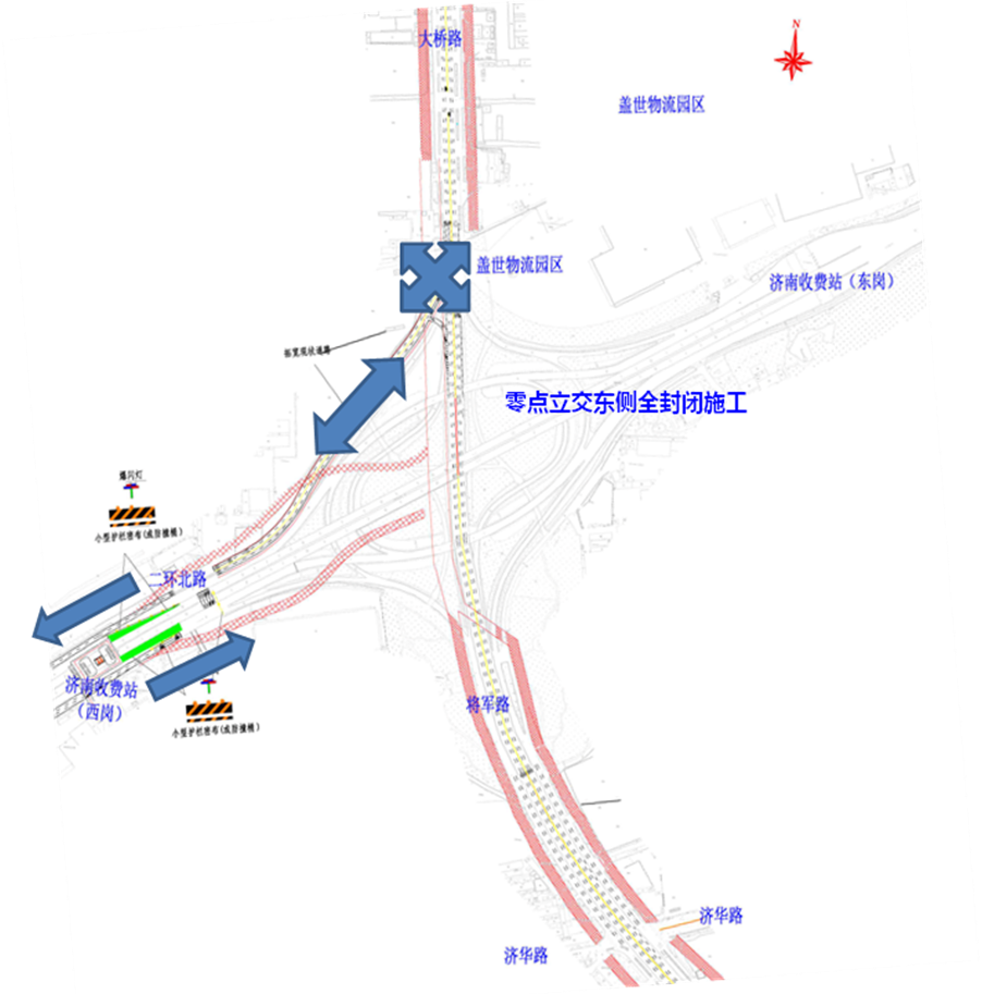 在此期间,零点立交桥下的大桥路南北向及G35济广高速主线东西向车辆正常通行。二环北路由西向东前往零点立交以北的左转车辆,需通过零点立交桥西北象限扩建现状道路与大桥路交叉口(现状灯控口)进行交通转换。其它车辆均需通过外围相关道路绕行。