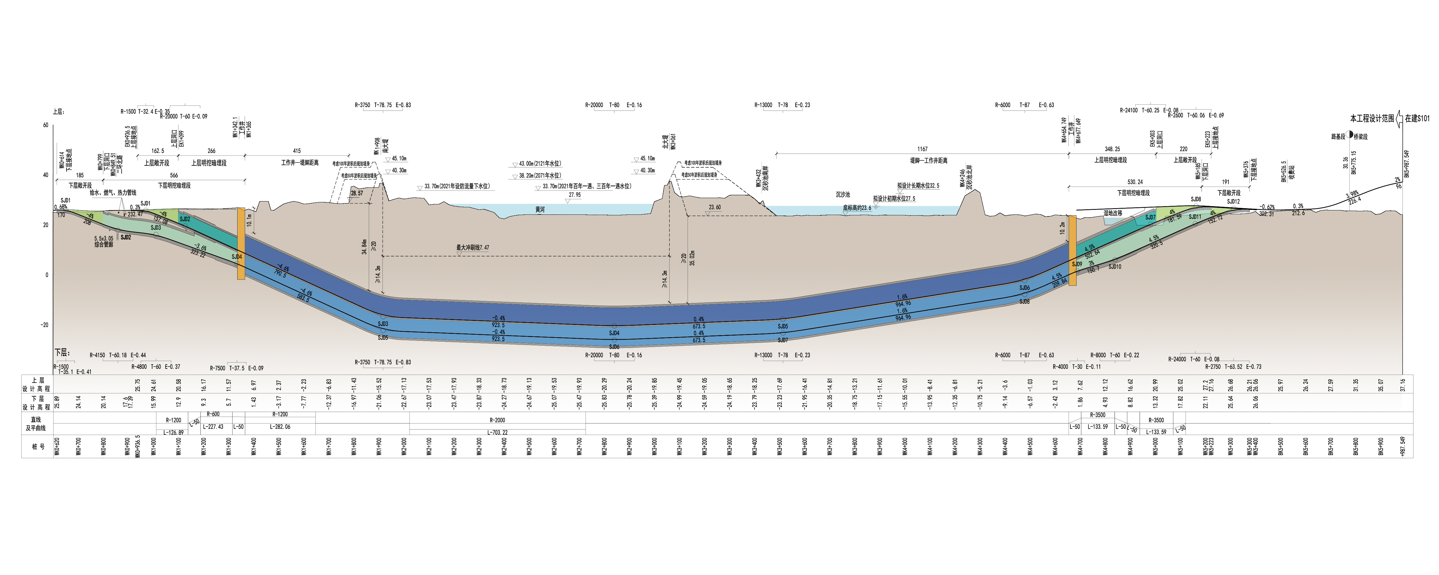 济南黄河黄岗路隧道定位为小客专用通道,并兼顾消防救援、公交通行需求。项目净空高度达到了4.2米,可以满足规范中所有不超限车辆正常通行,也可满足消防、管理及救援的要求。施工过程中,隧道需穿越鹊山水库沉砂池的一级水源保护,盾构施工拟采用环保浆液,同时根据土层渗透性情况复核浆液的辐射范围,确保盾构穿越时浆液不串入沉砂池,实现对一级水源保护地的无害化穿越。