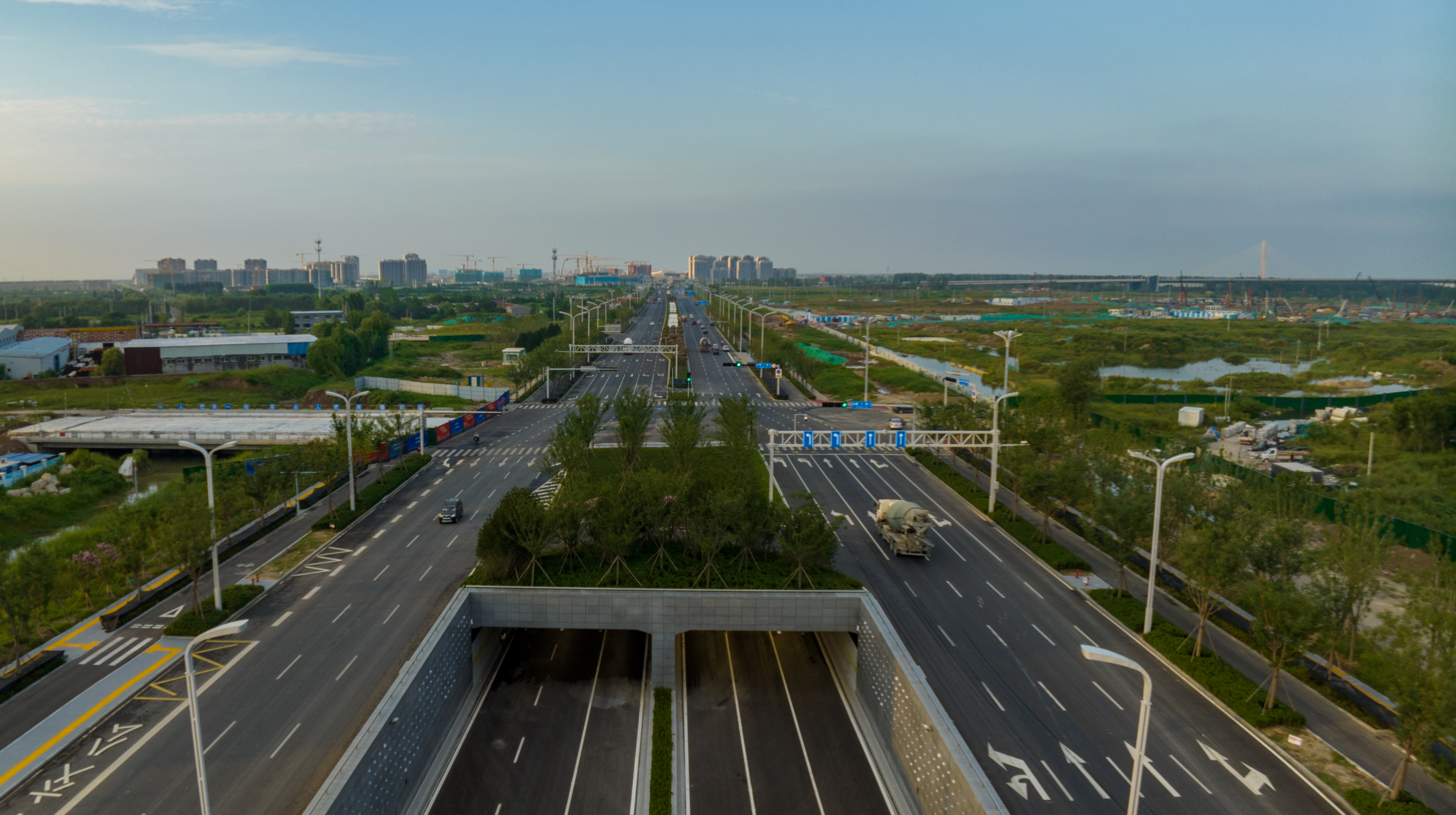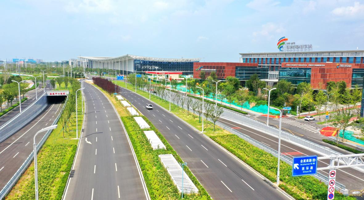 建设过程中,也积极探索各项环保新举措。此次通车的路段全线主辅路机动车、非机动车道下面层采用厂拌热再生沥青混凝土,节省大量用料,取得显著经济和社会效益。采用了环氧沥青混凝土作为路面材料,在全市首次实行全厚式沥青摊铺技术,有效减少了水泥稳定碎石使用量,同时将施工工期缩减为原来的60%左右。而黄河体育中心地道结合环评要求,充分利用地道特点及中分带条件,采用“竖井自然通风为主+射流风机辅助”的复合通风方式,利用地道内外风压差和热压差进行通风换气,无需设置大型轴流风机房,节约通风系统设备的同时,每年更能节约用电约500万度,践行低碳理念。
