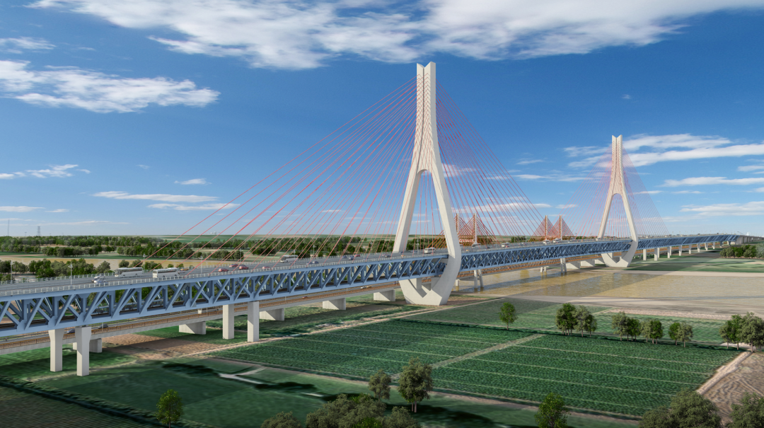 济泺路穿黄北延隧道工程项目位于济南市新旧动能转换先行区大桥片区,工程线路起自黄河隧道敞开段,以盾构隧道方式下穿邯济铁路、鹊山水库后接入省道S101,以明挖暗埋方式下穿石济客专及邯胶联络线,过科学城南边界路后出地面,继续向北直至国道G308(北延工程终点)。在工程起点设一对地面出入口与G309进行交通联系,终点与G308平交。隧道采用双向六车道公铁合建隧道方案,隧道外径15.2m,工程总长4383m,其中隧道总长度3228m,盾构段长度2045m。上层道路采用城市主干路标准,双向六车道,设计速度60km/h。下层轨道交通采用市域铁路标准,设计速度100km/h。
