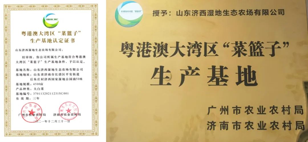 近日,山东济西湿地生态农场有限公司通过粤港澳大湾区“菜篮子”生产基地认定,并被授予认定证书和基地牌匾,标志着济西农业高质量的特色农产品获得“通行证”进入粤港澳大湾区的“交易大厅”,为公司农产品开拓粤港澳市场奠定了基础。