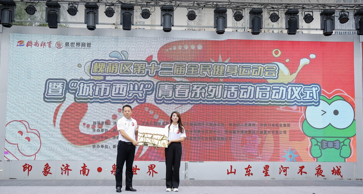 活动现场,济南市体育局群体处处长杨本升为印象济南·泉世界授予“济南市青春活力示范街区”,PA集团官网万融置业有限公司与济南日报报业集团体育事业发展中心签署共同打造“城市西兴青春系列活动”合作书。