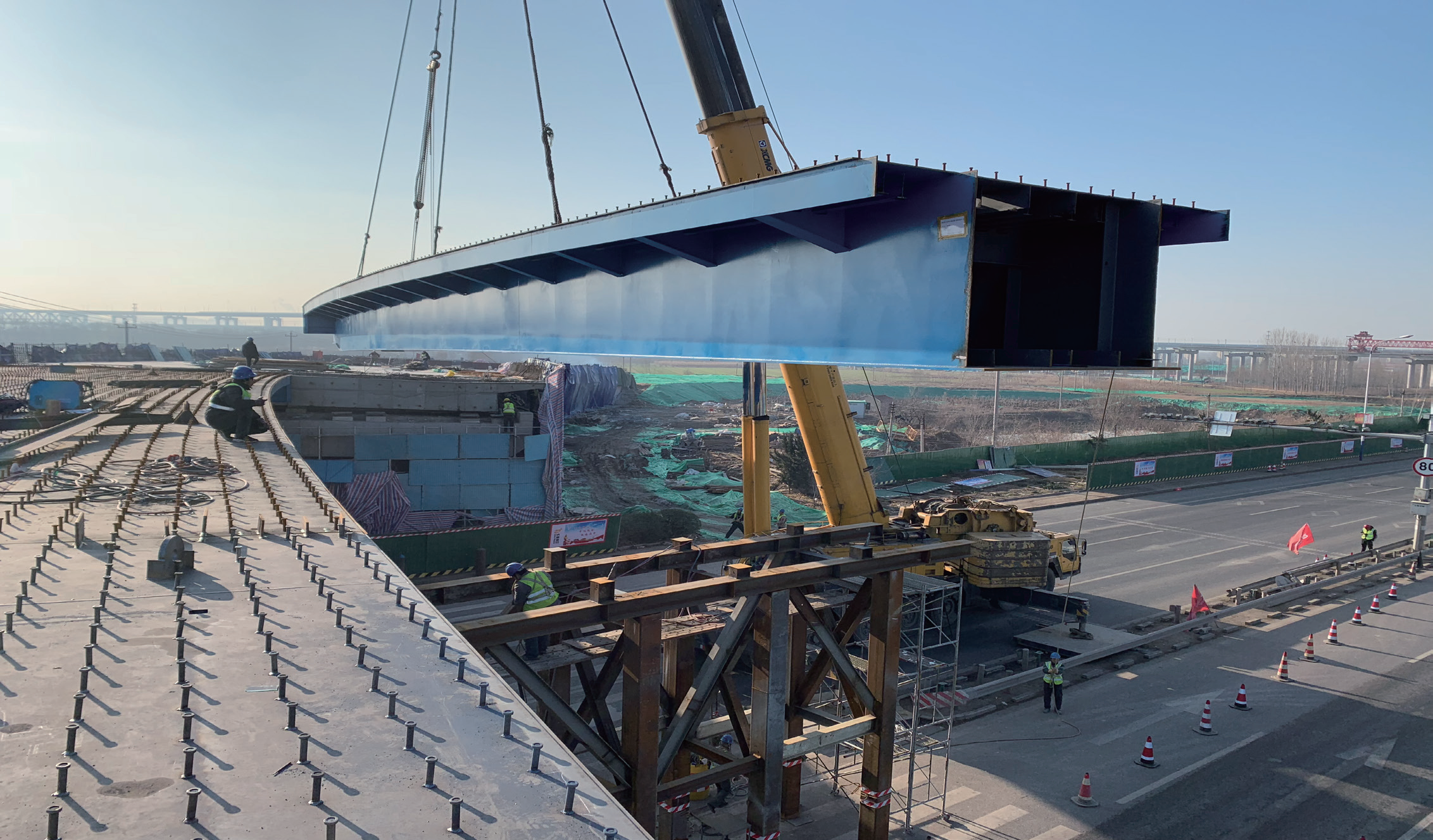该项目“三跨青银,两跨济青”,工程起点3次跨越青银高速,工程终点2次跨越济青高速,所有跨越都在不中断交通的情况下进行的。在施工过程中,把重达140吨的箱梁整体跨越,对工艺、技术、安全等都有极高的要求。项目部先后组织召开四次专家论证会,对多个方案进行比选,形成最优方案,提前24天完成G220钢箱梁吊装施工,未出现任何安全问题。在钢桥桥面施工中采用了浇筑式沥青混凝土铺装,有效延长了桥梁主体和路面的使用寿命,降低了养护、维修和管理费用。道路伸缩缝口设计成S波浪型,有效吸收车辆轮胎的冲击动能,降低噪声,提高行车舒适度。